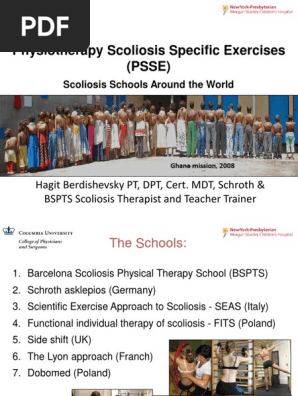 The exercises are called physiotherapeutic scoliosis specific exercises PSSE and need to be performed from twice a week to daily and occasionally several times a day. This requires a lot of motivation. They are not specific to Schroth treatment but will improve proprioception spinal mobility and stability.